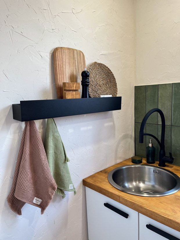 Черный — акцентный в нашем дизайне, поэтому решили сделать черный кран на кухне, контрастные ручки на фасадах и розетки с выключателями. На белой стене в качестве яркого акцента мы повесили черную дизайнерскую полку из металла. Она не только красивая, но и функциональная. На ней мы храним элементы для ежедневной сервировки, перечницу, доски. А благодаря скрытым крючкам у кухонных полотенец всегда есть свое место.