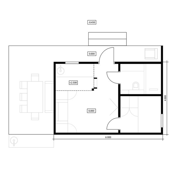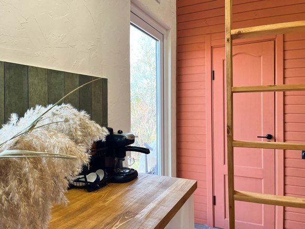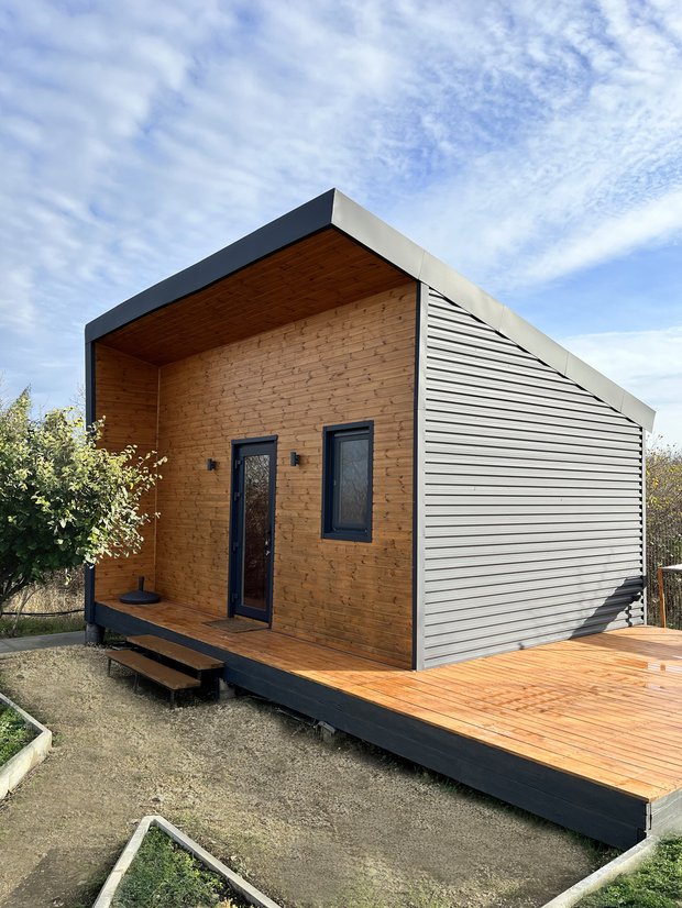 Планировку дома мы полностью продумали сами, исходя из сценариев и функций, которые будут происходить в доме. В итоге у нас есть кухня-гостиная, санузел, спальня. Сделали большую террасу, на которой обожаем проводить время, встречать гостей, работать и заниматься вместе йогой. Терраса будто бы стирает границы между замкнутым пространством дома и безграничной природой. Это очень интересные чувства, которые мы познали, именно пожив в доме.