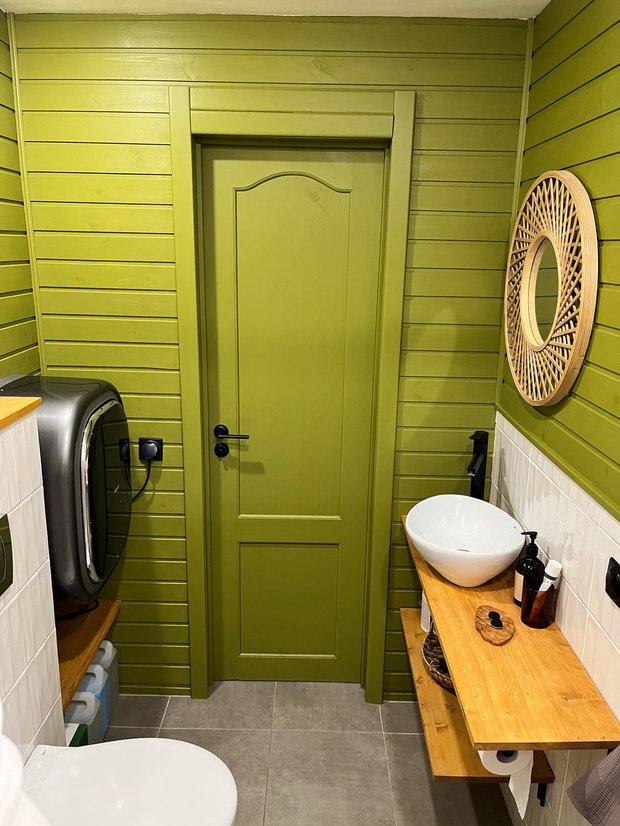 Машинка стала отличной альтернативой привычным устройствам и по габаритам, и по дизайну. Кстати, дверь в ванную комнату выкрашена в цвет стен: с одной стороны эта дверь зеленая, а с другой — терракотовая.