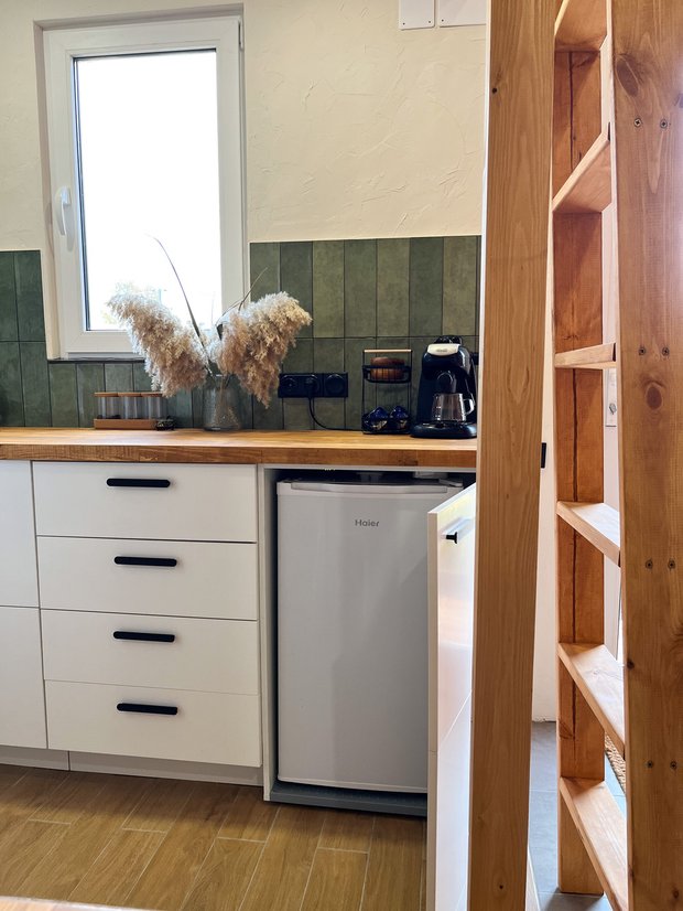Мы очень не хотели загромождать помещение и не устанавливали стационарную варочную поверхность: в одном из ящиков у нас хранится индукционная плита, которую мы достаем при необходимости.
