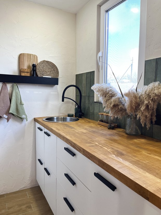 Столешница на кухне из массива сосны толщиной 4 см, которую мы сами отшлифовали и покрыли специальным маслом в нужный нам цвет. Столешница из натурального дерева — это особая эстетика и красота текстуры дерева. Мы очень довольны, что сделали именно так.