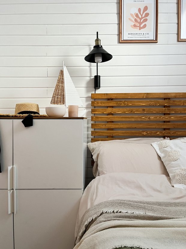 Кровать состоит из деревянного изголовья и металлического основания. Основание приобрели на маркетплейсе, а вот изголовье сделали сами. Купили в строительном магазине деревянные бруски, распилили под нужный размер, отшлифовали, пропитали дерево маслом, придав ему цвет. Получилось классное решение, которое можно легко воплотить.
