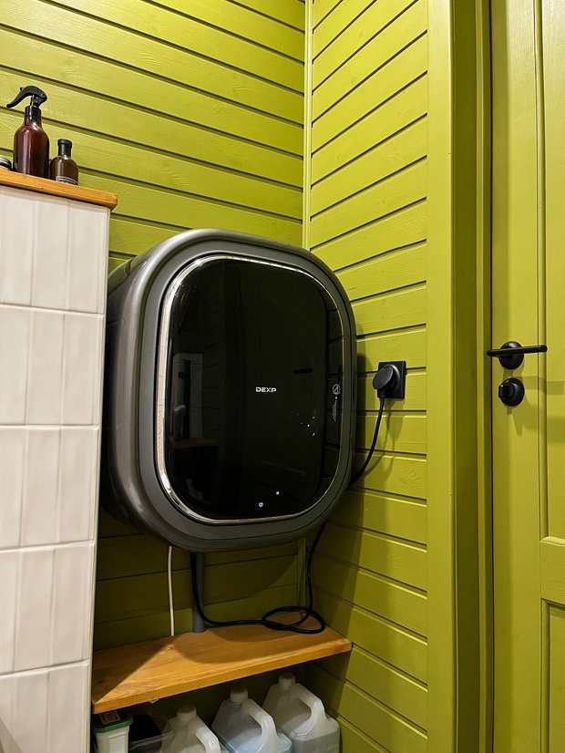 Еще один интересный ход — настенная стиральная машинка. Она занимает совсем мало места, крепится на стену. Компактная и очень стильная. Будто космический объект в нашей ванной. Загрузка вещей небольшая — 2,5 кг — но для нас этого вполне достаточно.