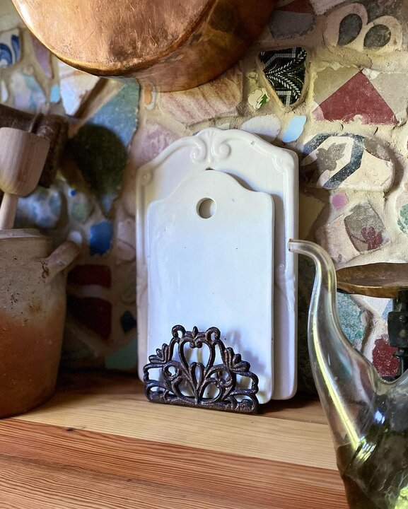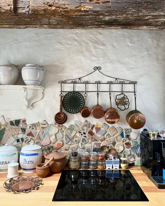 С посудой здесь, конечно, перебор, но как же мне нравится разглядывать детали… От железной подставки для керамических досок до фартука из битого разукрашенного камня.