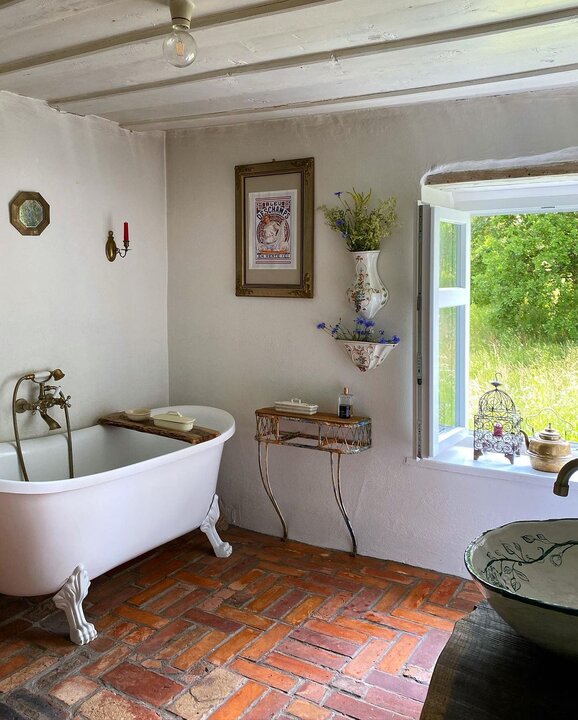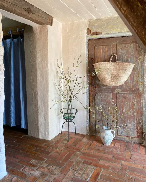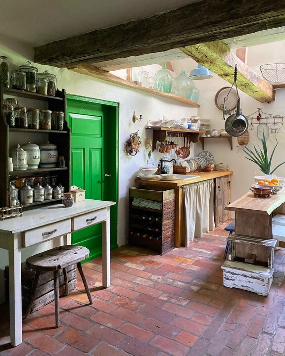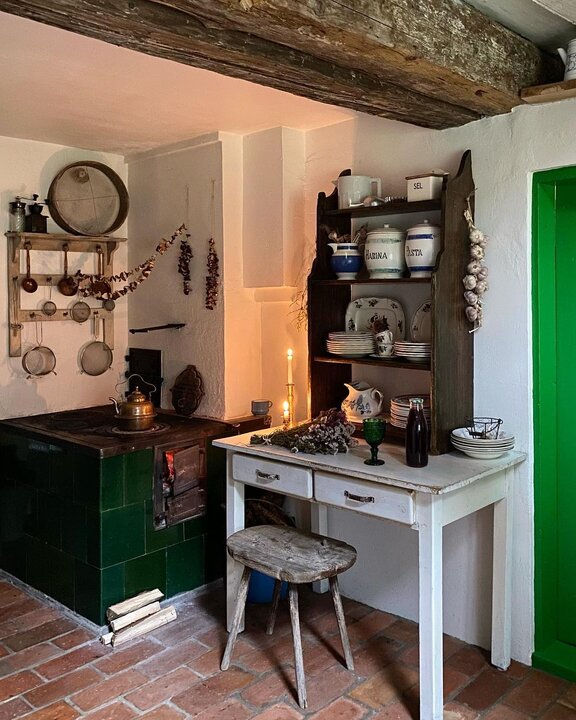 Кухня — самое необычное (по-крайней мере для меня) место в этом доме. Интерьер переносит тебя назад на 100-150 лет. Голые кирпичные полы, стол из слэба, занавески на шкафчиках и куча-куча винтажной посуды на видном месте.