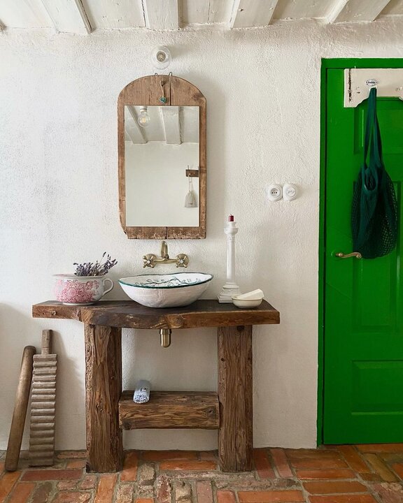 Этот домик больше всего похож на лавку старьевщика. Здесь практически нет новых вещей. Кухонный гарнитур сделан из чего попало. Вместо обеденного стола — грубая доска. Двери и напольное покрытие не видели ремонта с позапрошлого века. Вместо привычных аксессуаров и мебели — столетние табуретки, топчаны вместо кроватей и медная бабушкина посуда…