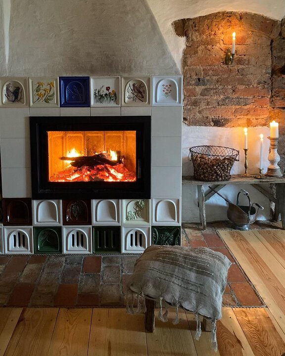 Камин украшен плиткой ручной работы.