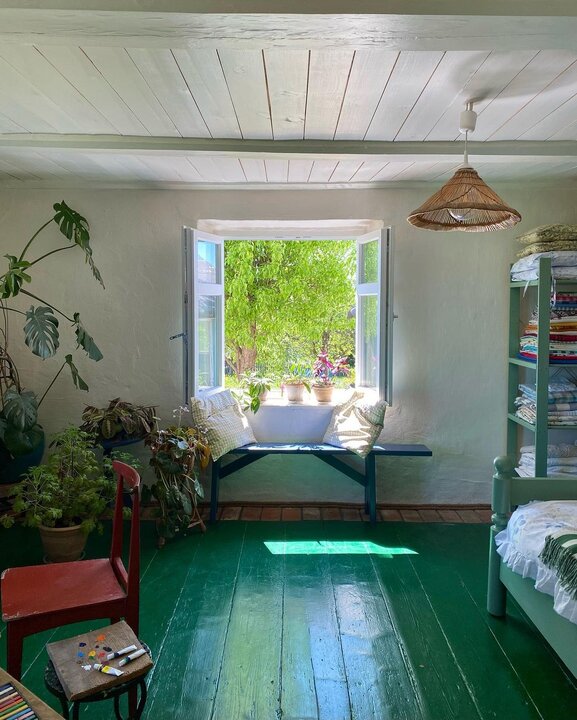 Хозяйка предпочитает не показывать спальню. Оттуда есть только такой кадр. Меня смущают зеленые полы, но в целом и они тут смотрятся неплохо, гармонично.
