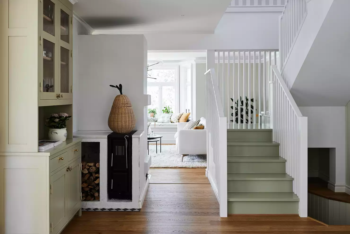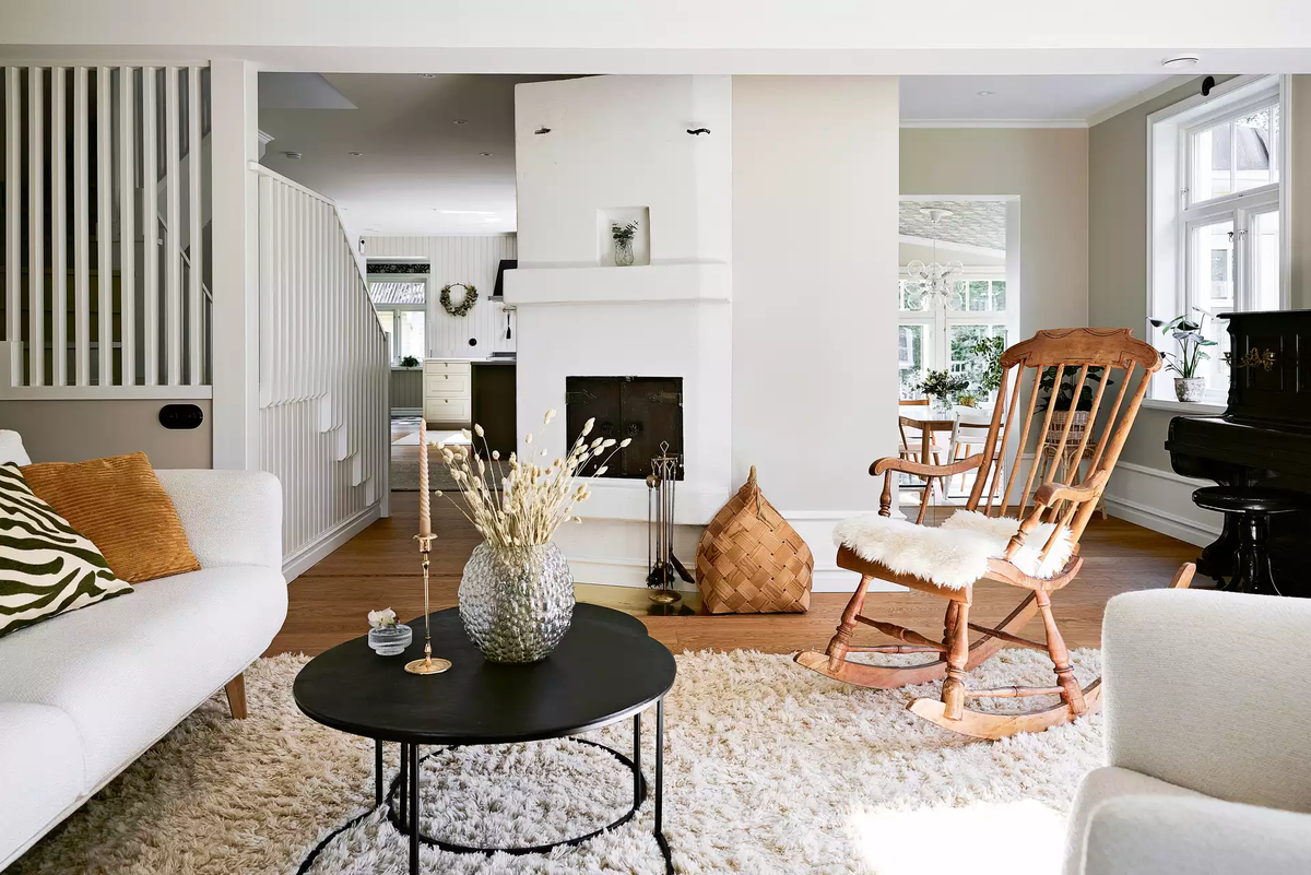 Из гостиной можно попасть в столовую или в прихожую, где расположена лестница на второй этаж (там находятся спальни). Кстати, камин — оригинальный. Он здесь был еще в 70-х. Сначала Карин с мужем хотели заменить его на современную печь-камин, но потом передумали — негоже избавляться от такой памяти