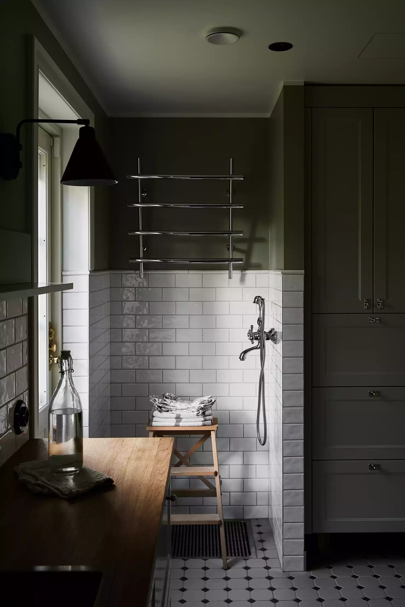 Плитка уложена под кирпич, а верхняя часть стены (как и потолок) окрашена в темно-оливковый цвет