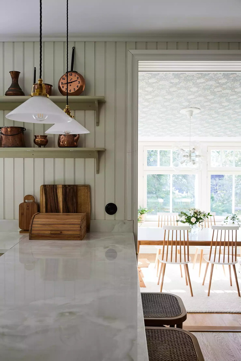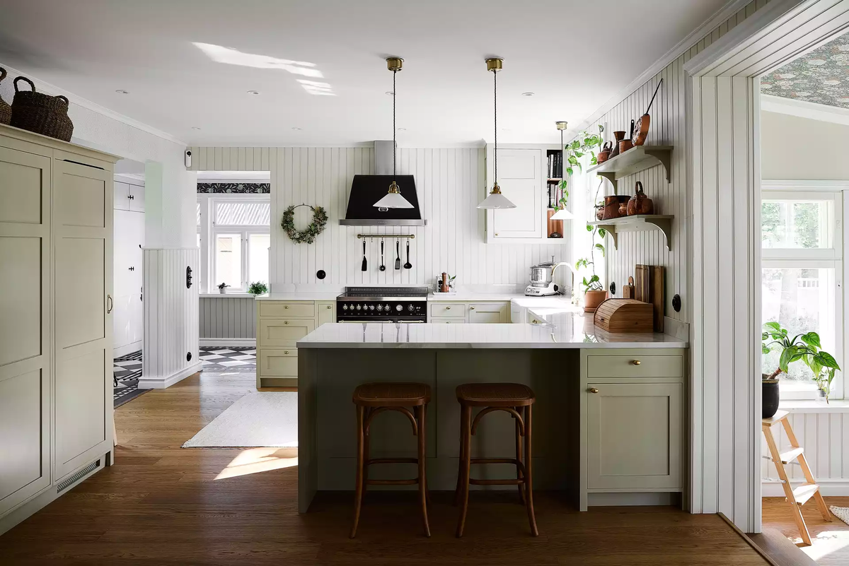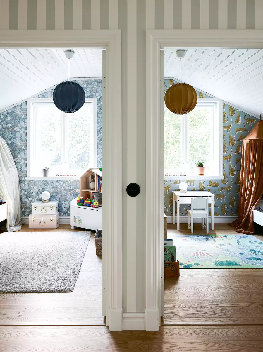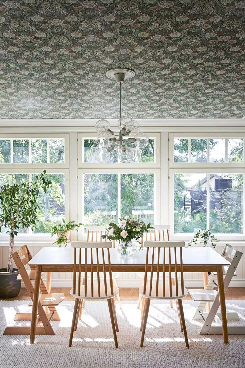 Отмечу необычное интерьерное решение в столовой — обои на потолке (семья выбрала ботанический принт от Boråstapete). Эту идею Карин увидела в чьем-то инстаграме.