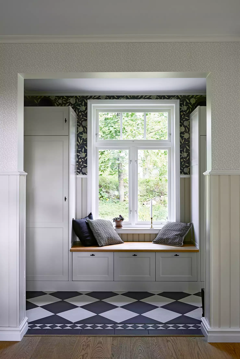 И предпоследний кадр — из прихожей. Здесь сразу несколько темных акцентов — плитка на полу и легендарные обои William Morris. Зону под окном использовали рационально — сделали скамейку с допместами для хранения обуви