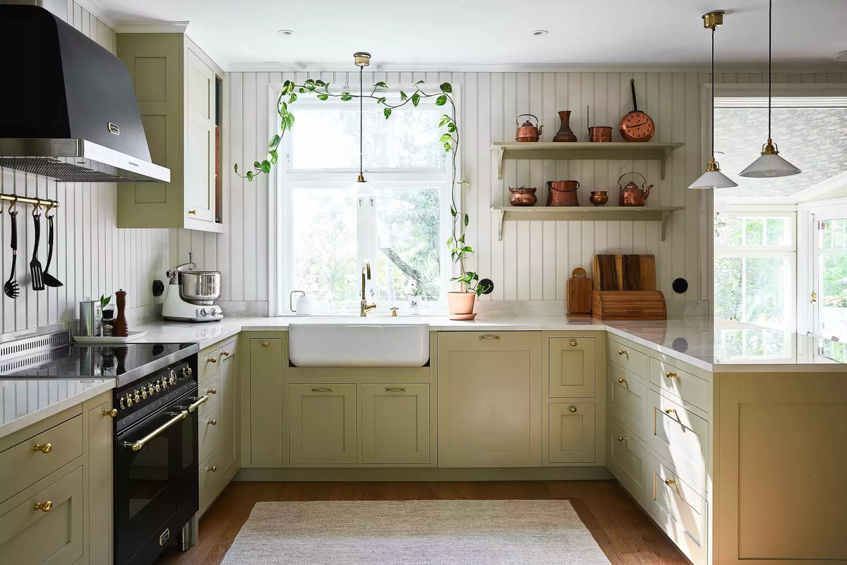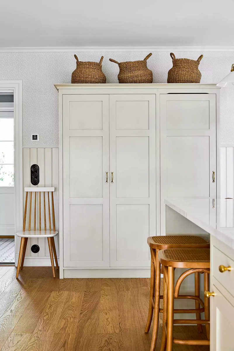 Кухонные шкафы вынесены в отдельное место. В зоне готовки еды (там, где стоит ключевая бытовая техника) нет верхних шкафов. За счет этого кухня кажется очень свободной, воздушной