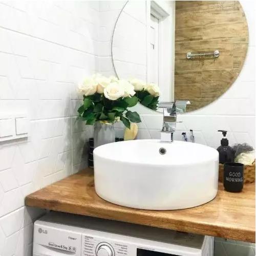 После обновления входной двери мы видим современный тренд — объединение умывальника, столика и стиральной машины на компактном участке. Этот подход идеально подходит для небольших ванных комнат, эффективно используя ограниченное пространство.