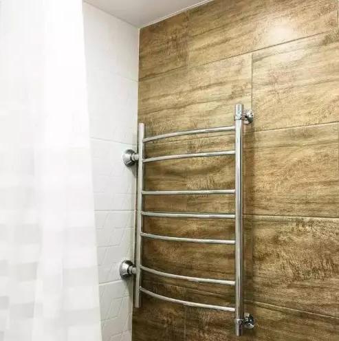 Особое внимание уделено декору уголка с змеевиком и стеной с уникальной текстурой. Плавный переход от светлой плитки к плитке с текстурой дерева придает интересный вид.
