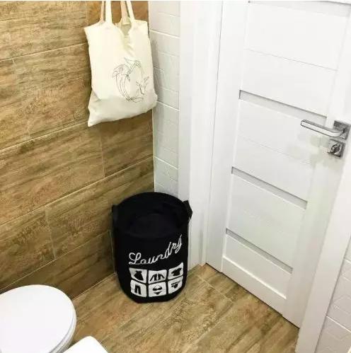 Вместо корзины для белья выбран специальный мешок, который легко вписывается в угол возле двери. Результатом ремонта стали максимальная оптимизация пространства и удовлетворение от полученного результата.