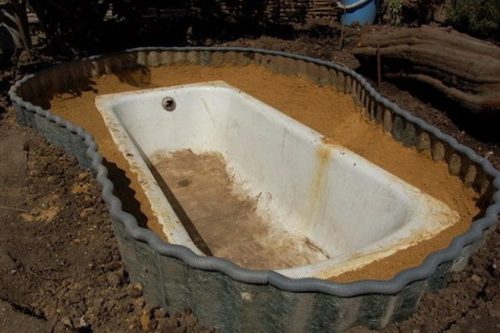 В начале необходимо выбрать участок, где вы планируете создать водоем. Придётся активно поработать лопатой и вырыть отверстие достаточное, чтобы поместить в него ванну. Не забудьте сформировать бортики.