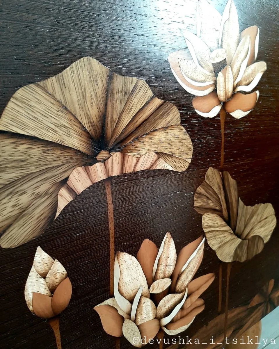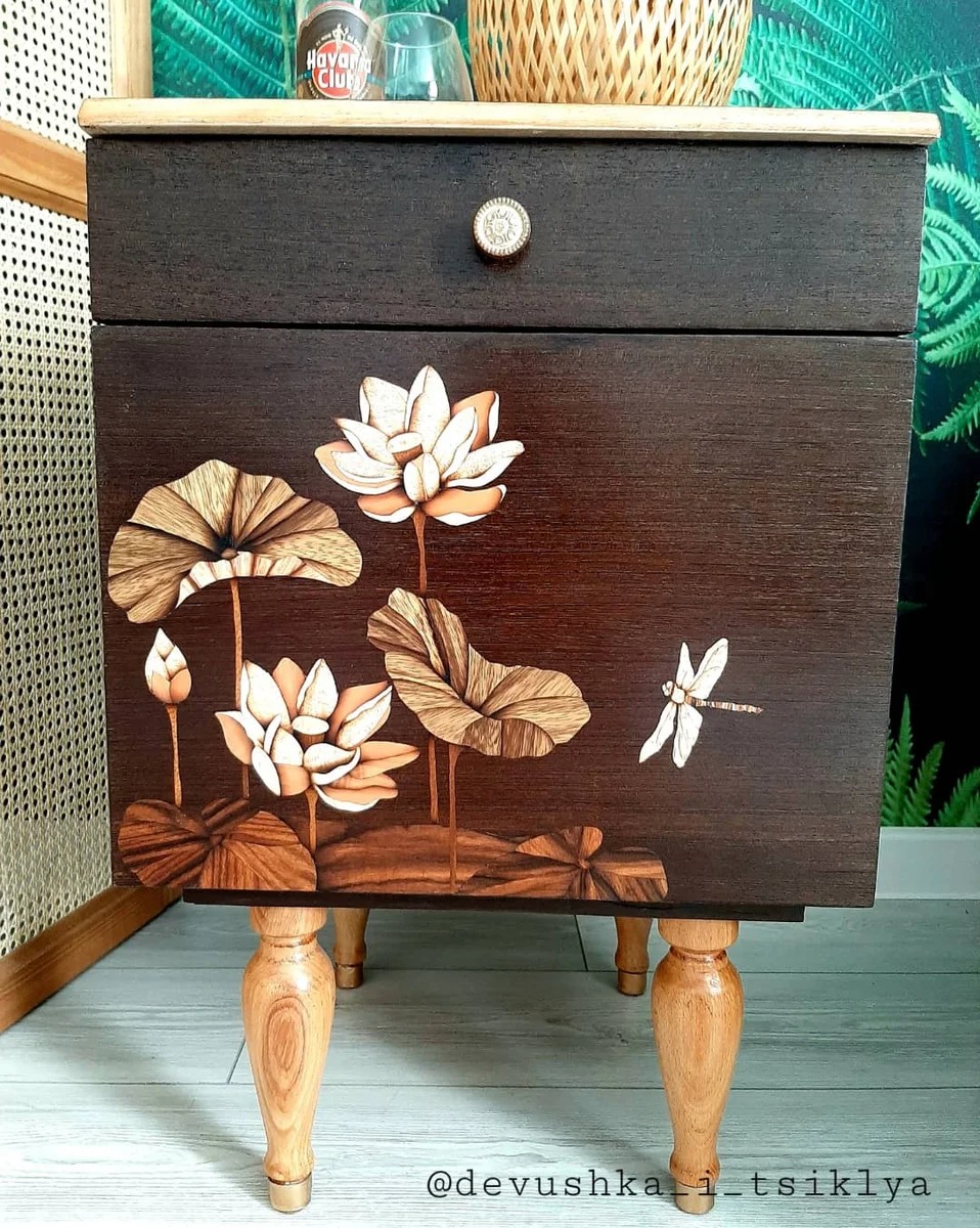Ну и дверка. 🌹🌹🌹 Она должна была стать акцентом в этой тумбе. Поэтому из темной глади венге, видны шёлковые лотосы, которые плавно покачиваются на невидимой поверхности воды.