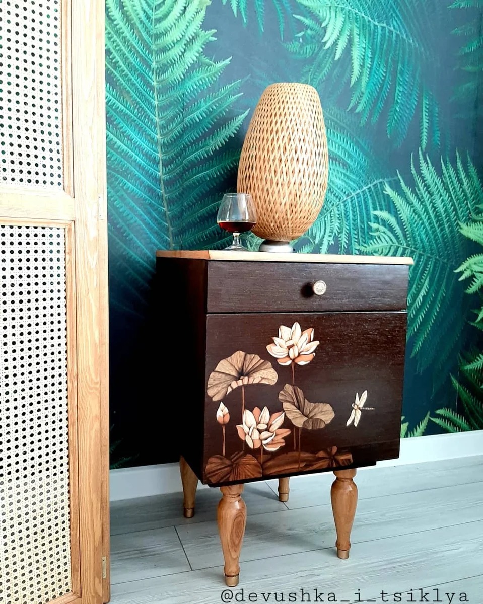 Теперь эту тумбочку не узнать. Из рыжика она превратилась в изысканный предмет интерьера.