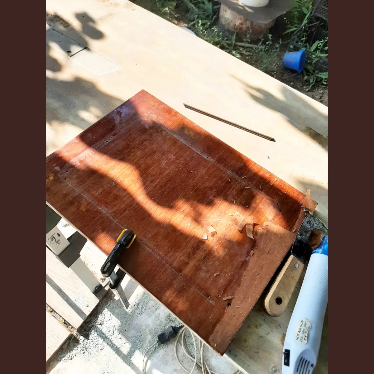 С тумбочки я сразу убрала пластиковые молдинги. Покрытие из полиэфирной смолы убирала строительным феном.