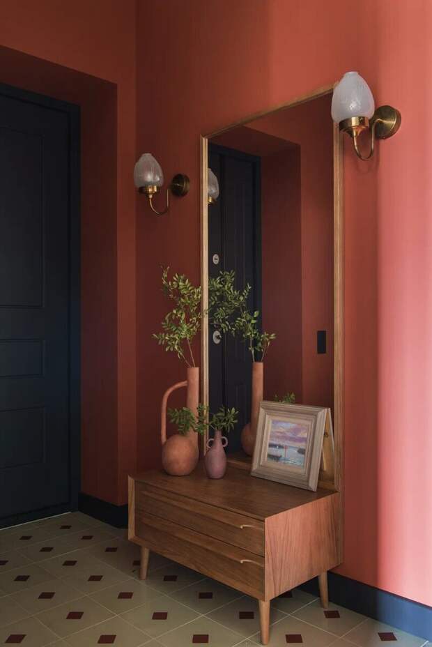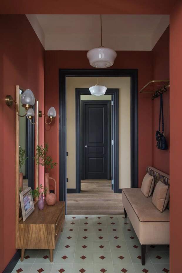 Между прихожей и коридором нет дверей, но чтобы зонировать пространство Алиса решила использовать разное напольное покрытие. В «грязной» зоне — плитка, которая классно сочетается с терракотовыми стенами