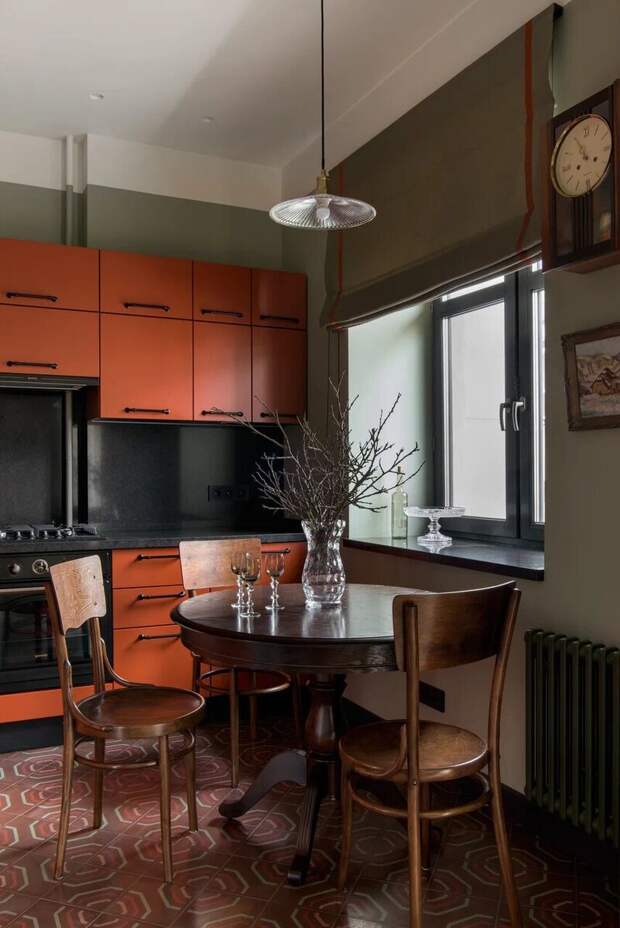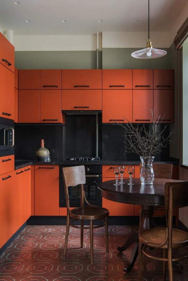 Я не очень люблю цветные фасады кухонных гарнитуров (мои цвета-фавориты на кухне — белый и молочный), но здесь оранжевый с красно-коричневым оттенком смотрится очень элегантно. Вроде ярко, но не надоедает