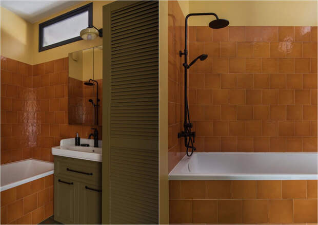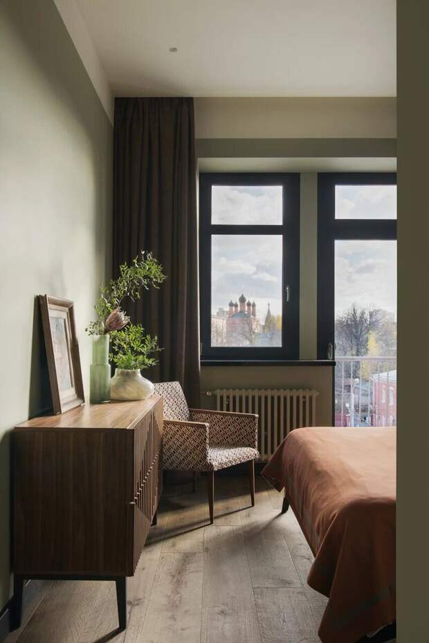 Доминирующие цвета в квартире — охра, терракотовый, оливковый, серый, черный, все оттенки коричневого, глубокий жёлтый. В той или иной комбинации эти оттенки встречаются во всех комнатах
