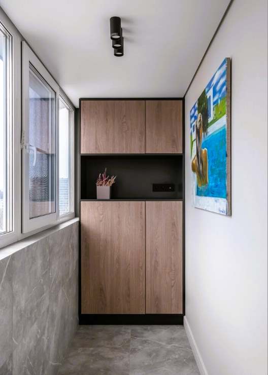 Примыкающий к спальне балкон тоже полностью благоустроили. В дальнейшем, хозяева хотят организовать здесь спортивный уголок с тренажерами, но пока здесь поставили лишь шкаф для хранения спортивного инвентаря.