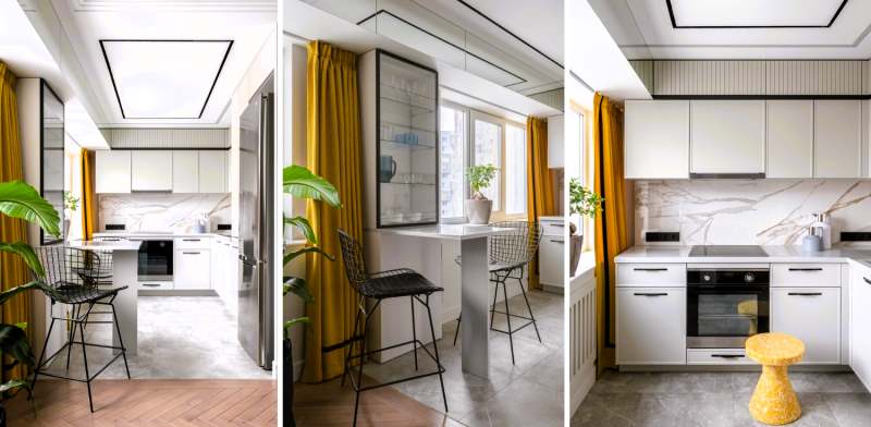 В кухонной зоне установлен вместительный угловой гарнитур с фасадами молочного оттенка. Фартук облицован керамогранитом. На границе между кухней и гостиной установлена небольшая барная стойка для завтраков со стеклянным шкафом.