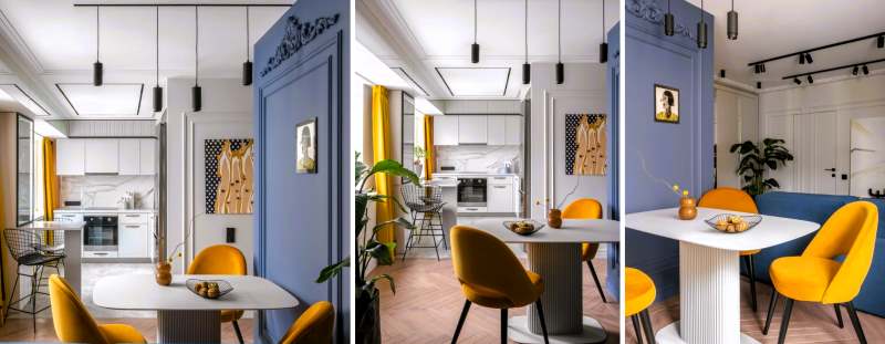 Рядом с обеденной зоной появилась акцентная стена, которую выкрасили в серо-голубой оттенок (с другой стороны перегородки расположен шкаф в прихожей).