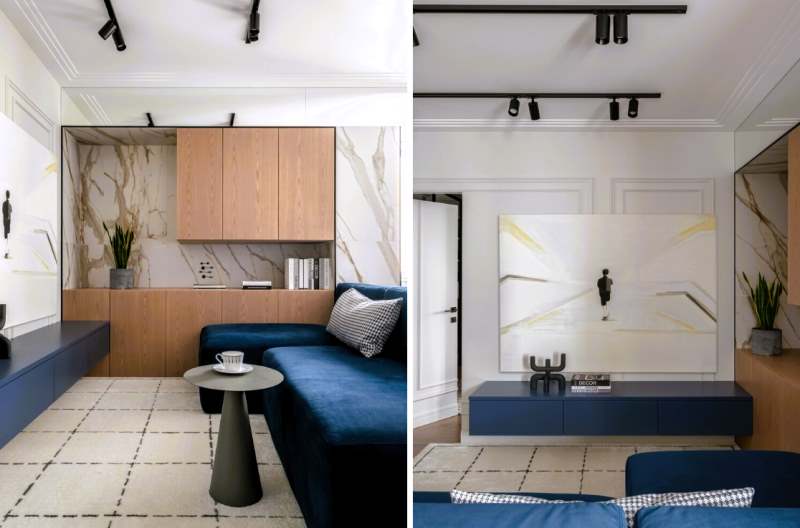 Здесь же поставили угловой диван в синем цвете. Рядом организовали систему хранения и телевизионную зону, но пока без телевизора.