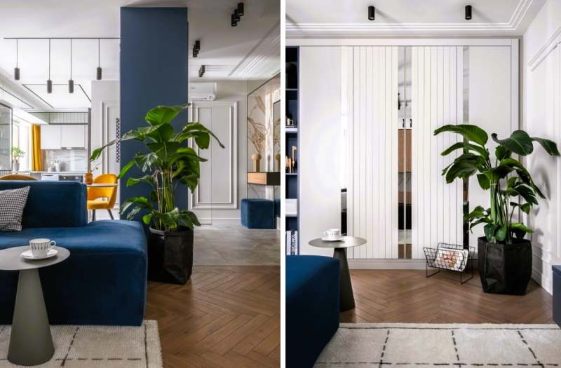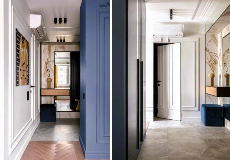 Пол во входной зоне оформили крупноформатным керамогранитом под камень, а стены покрасили в светлый оттенок и дополнили молдингами. Дверь в ванную комнату сделали скрытого типа. Справа от входа расположились большое зеркальное панно, подвесная консоль и пуф. Напротив входной двери организовали нишу, где был установлен вместительный гардероб.
