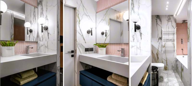 С правой стороны от входа установили шкаф со стиральной и сушильной машинками, а также хозяйственный блок. Над унитазом организовали места для хранения бытовой утвари. Что касается отделки, то здесь использовали два вида керамогранита, розовую плитку и водостойкую краску.