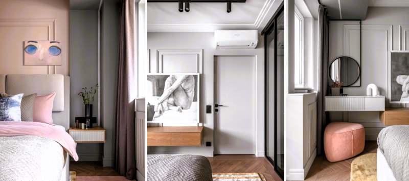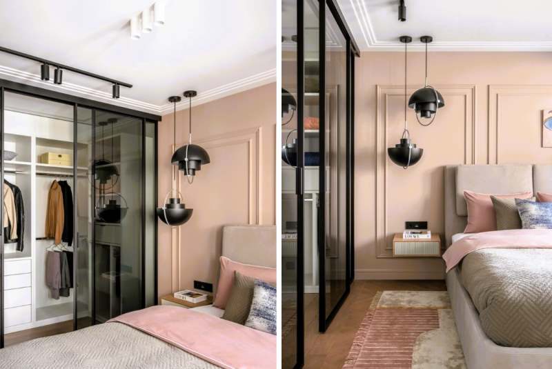 В спальне обустроили вместительную гардеробную со стеклянной перегородкой, которая состоит из двух зон: женской и мужской. Что касается отделки, то стены покрасили в два цвета: серый и приглушенны розовый оттенок (и дополнили стены молдингами). На полу уложена паркетная доска.