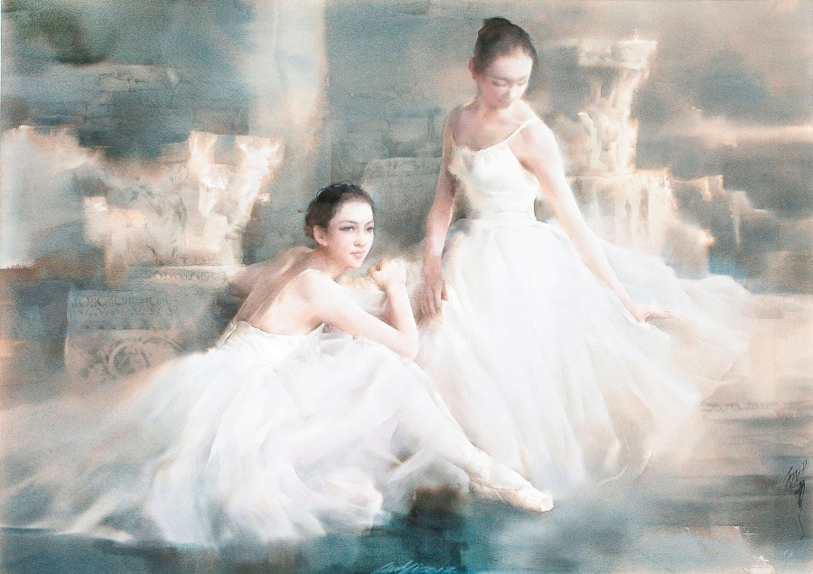 Акварели этого китайского художника можно смело назвать искусством об искусстве. Ведь его излюбленной темой являются образы людей, имеющих к нему непосредственное отношение, – к примеру, балерин или классических музыкантов. Своеобразен способ их подачи на картинах: люди как будто проступают из тонкой мглы, эмоциональные и очень характерные. В какой-то мере они перекликаются с образами балерин французского художника Эдгара Дега.