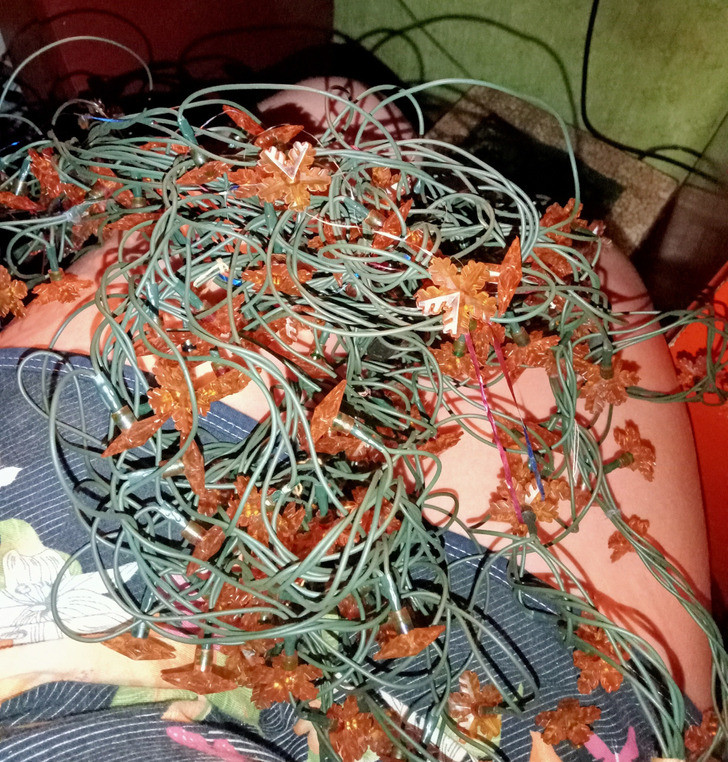 «Эта гирлянда сопровождает меня, сколько помню, и ведь мне весной уже исполнится 40 лет. Я распутывала ее в доме бабушки, в родительской квартире, в нашем общем доме, в новом городе. Прошла школу, институт, переезды, рождение детей, еще один институт… Гирлянда была перевязана узлами, пожелтела, но все еще работает».