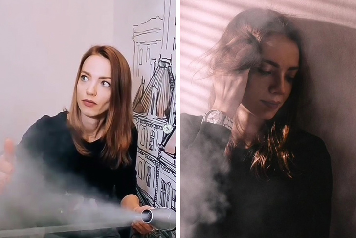 15. Дым-машина из фена делается при помощи влажной ватки, лучше пропитанной глицерином