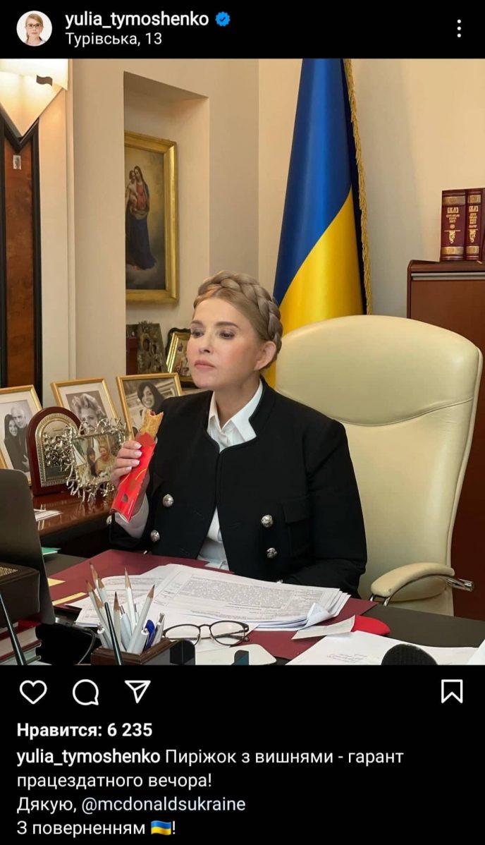 Пару дней назад политик поделилась фото, на котором запечатлела себя во время перерыва. Чтобы набраться сил Юлия Владимировна решила подкрепиться вишневым пирогом из Мак-Дональдса.