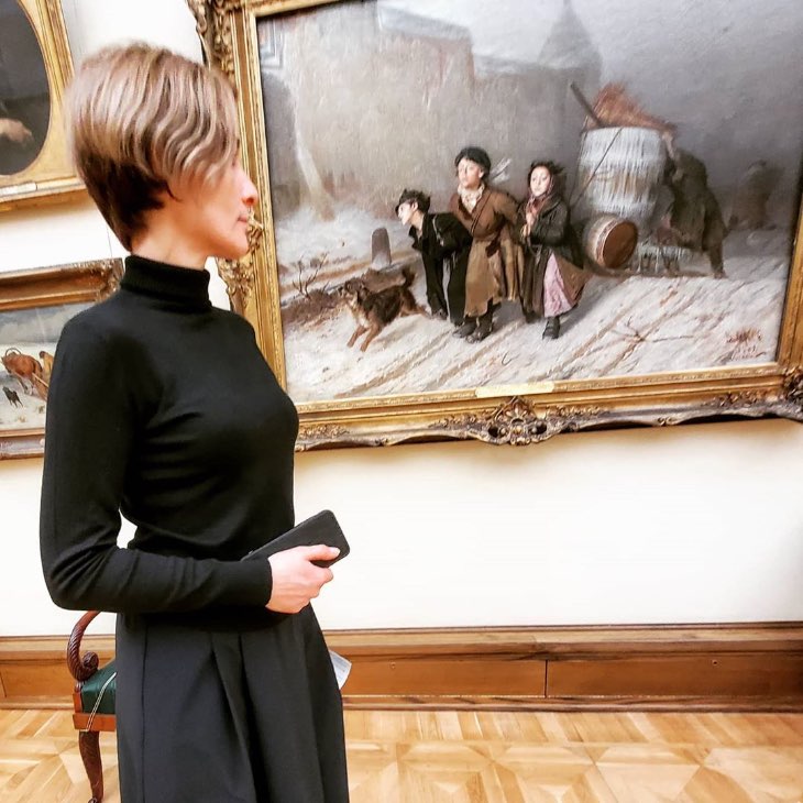 Оксана смотрит на картину «Тройка», не глядя на фотографа. Для выхода в свет женщина подобрала одежду, которая отлично подчеркивает ее фигуру – серую юбку средней длины, а также черную водолазку.