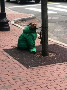 Американка пришла со своим псом на почту. В помещение с собаками входить запрещено, а на улице было очень холодно и ветрено. Тогда девушка оставила своего друга на улице, при этом укутав его своей курткой, чтобы он не замерз.