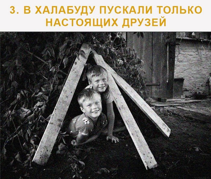 Одни из самых крутых воспоминаний с детства связаны с постройкой «халабуд», в строительстве которых принимали участие как мальчишки так и девчонки. Нам было в кайф сделать что то своими руками, где потом можно было собираться с друзьями, в своей маленькой крепости. Для этого из дома без разрешения брались доски, гвозди, молотки, пилы и прочий инструмент и строительный материал… Каждый тащил что мог.