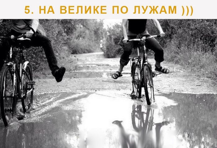 Что могло быть круче чем поднять ноги вверх (что бы не забрызгать) и промчаться на скорости по луже! Как же мы любили кататься на велосипедах после дождя. Опасность застрять посреди лужи и намочить нуги только прибавляла азарта.