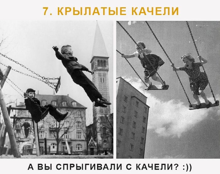 Смотрю на фото девочек, и дух захватывает. Я прямо чувствую как сейчас подгибаются от страха их коленки, но они не останавливаются, раскачиваются еще сильнее! Так же, было еще одно опасное развлечение — кто дальше вылетит с качели на ходу.