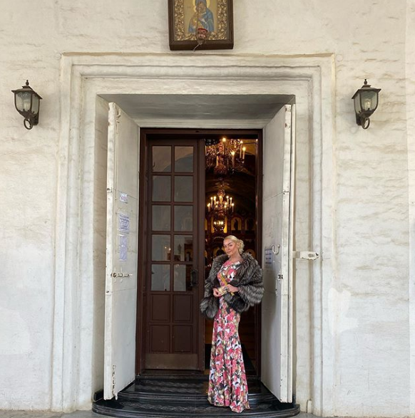 Настя выложила снимок в Инстаграм, где стоит у входа в храм, но подписчиков, естественно, удивило не это, а то, что Волочкова была одета в легкий летний сарафан, а поверх него…шуба!