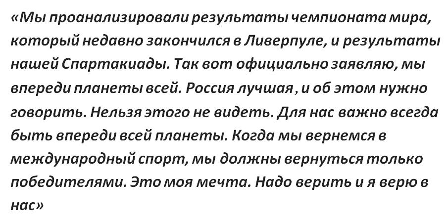 Многих озадачило сравнение соревнований мирового уровня и местной спартакиады. Другие же попросили ответить на резонный вопрос: если все так уж хорошо, к чему тогда желать возвращения на чемпионат мира?
