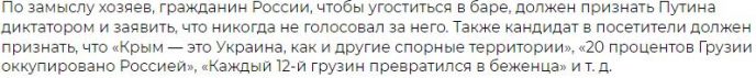 Так, например, у российских посетителей требуют, чтобы они произнесли следующие слова: «Крым- Украина. Я никогда не голосовал за ВВП». Решение владельцев тбилисского кафе обсуждают в Интернете.