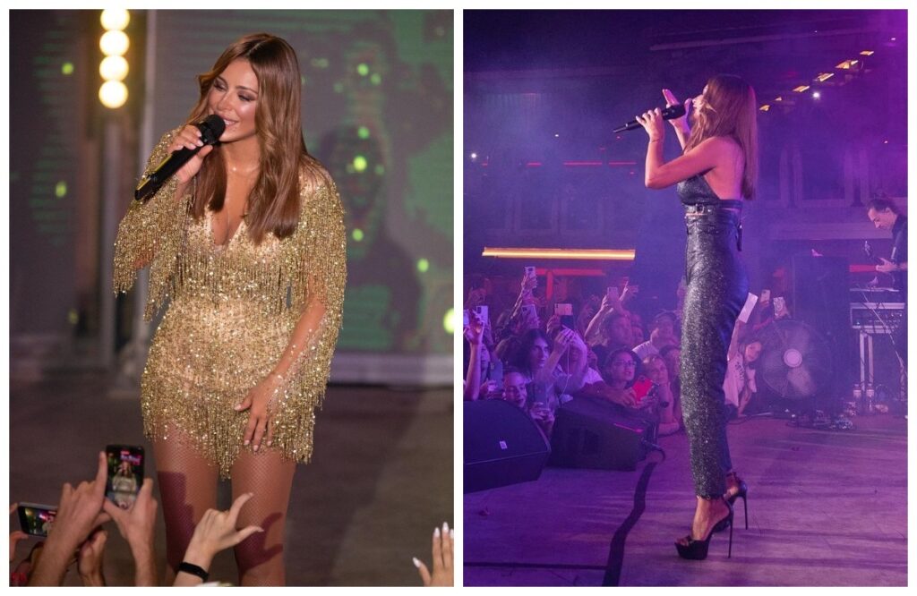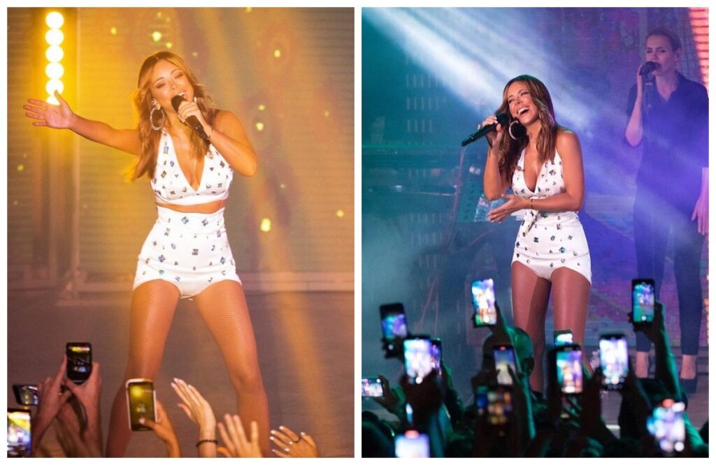 У себя в Инстаграми Ани Лорак выложила подборку фото с выступления в трех разных костюмах — белых облегающих шортах с высокой посадкой и стилизованном под верх от купальнике топе, золотистом платье выше колена с бахромой и черном блестящем комбинезоне. Каждый наряд артистка дополнила туфлями на высоких каблуках.