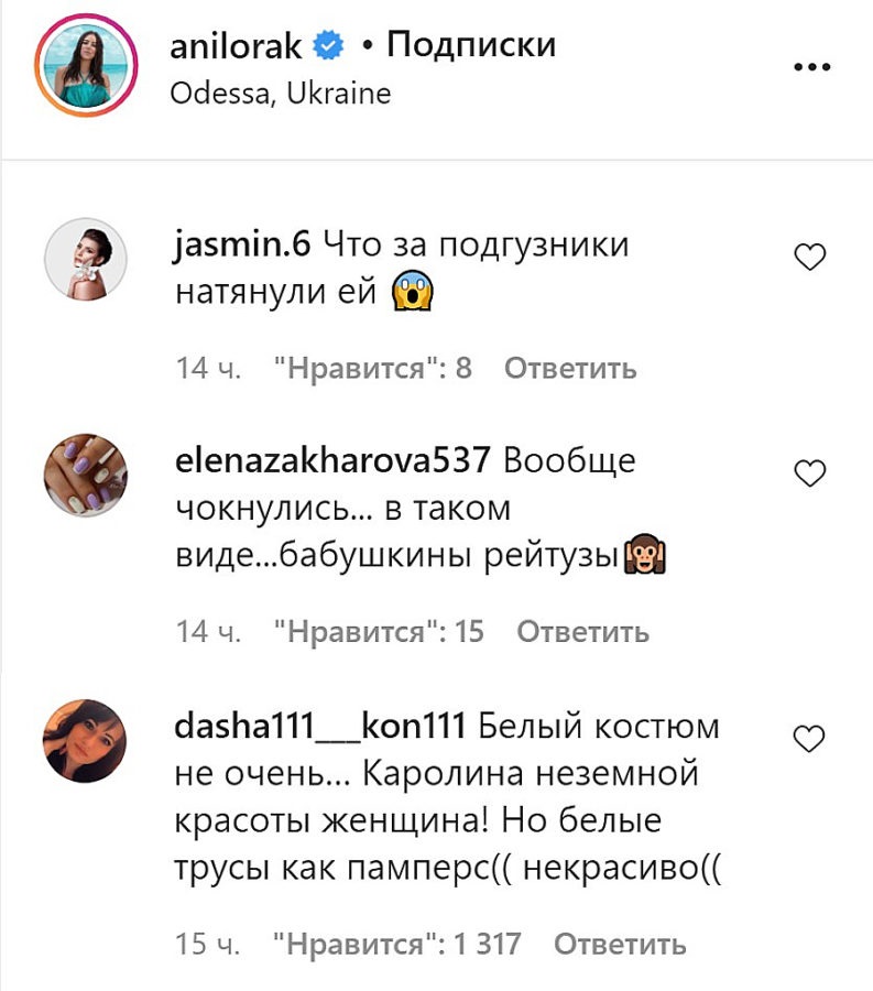 «Белый костюм не очень… Каролина неземной красоты женщина! Но белые трусы, как памперс, некрасиво», – написала разочарованная поклонница dasha111___kon111.
