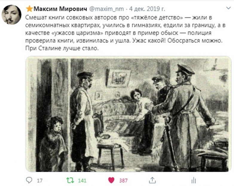 Писатели, кстати, как могли старались показать побольше «ужасов» царской России, но получалось это вяло и неубедительно — ах-ах, жандармы пришли ночью с обыском, поднялись по парадной мраморной лестнице, распахнули настежь трехметровые двойные двери, прошли через нашу сорокаметровую столовую, прошли мимо трех окон гостиной и в третьей спальне в пятом по счету шкафу нашли запрещенную бумажку. Как страшно мы жили!