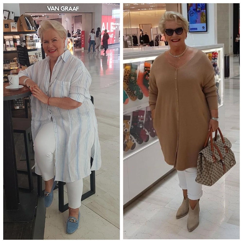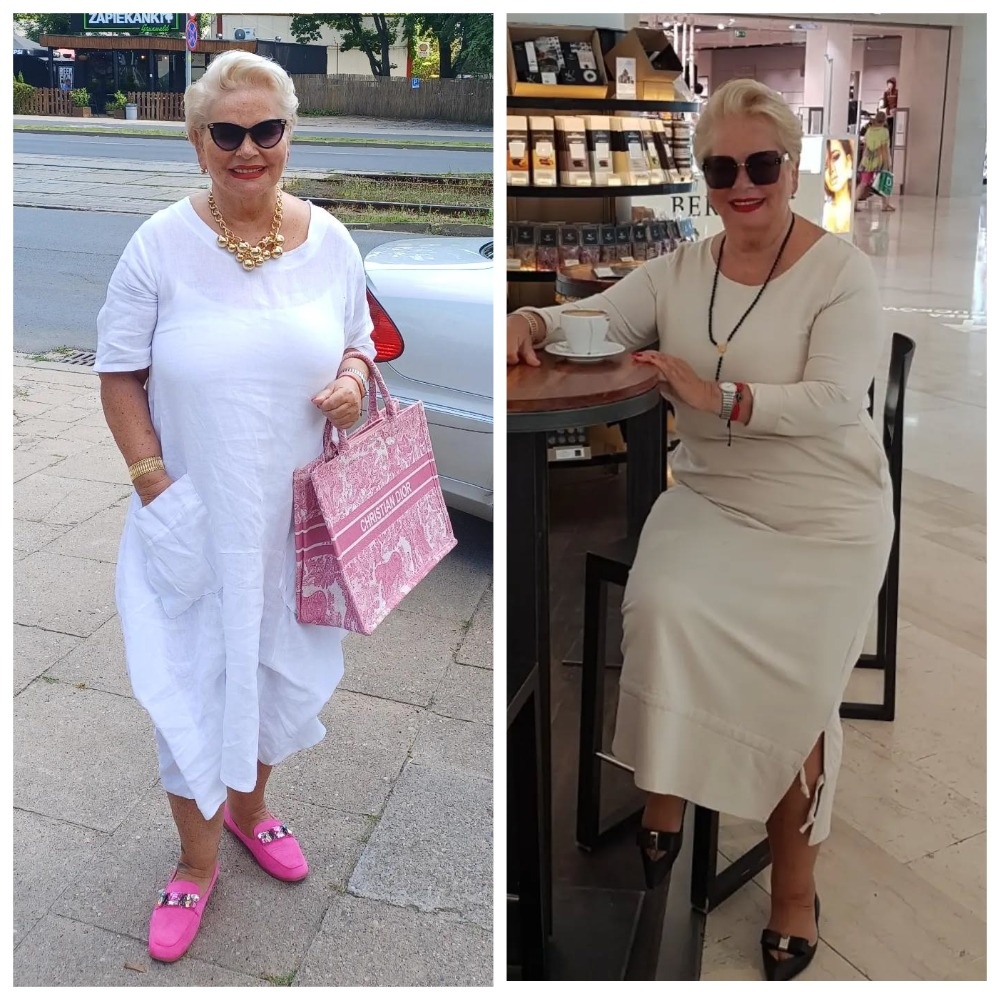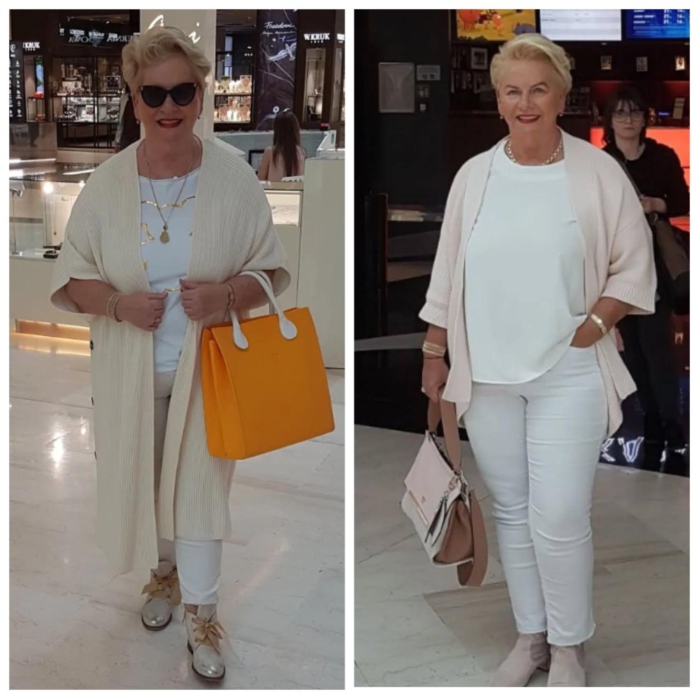 Чтобы не выглядело слишком просто, Ивона добавляет колье, интересные сумки и солнцезащитные очки. Эти яркие акценты помогают сместить фокус с глобальных недостатков фигуры и заметно преображают образ.